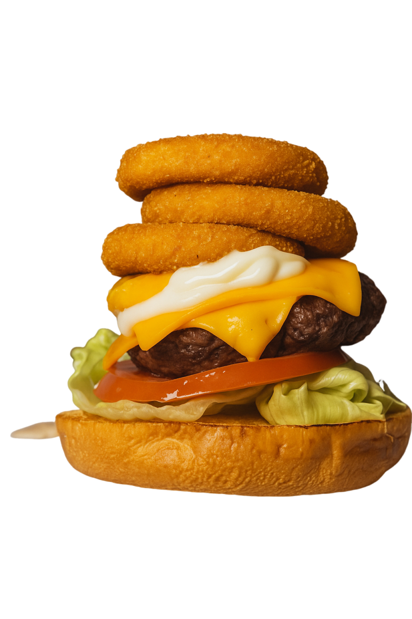 Pão brioche, Hambúrguer 120g, queijo cheddar, bacon, cream cheese, anéis de cebola, molho da casa, molho agridoce + Fritas