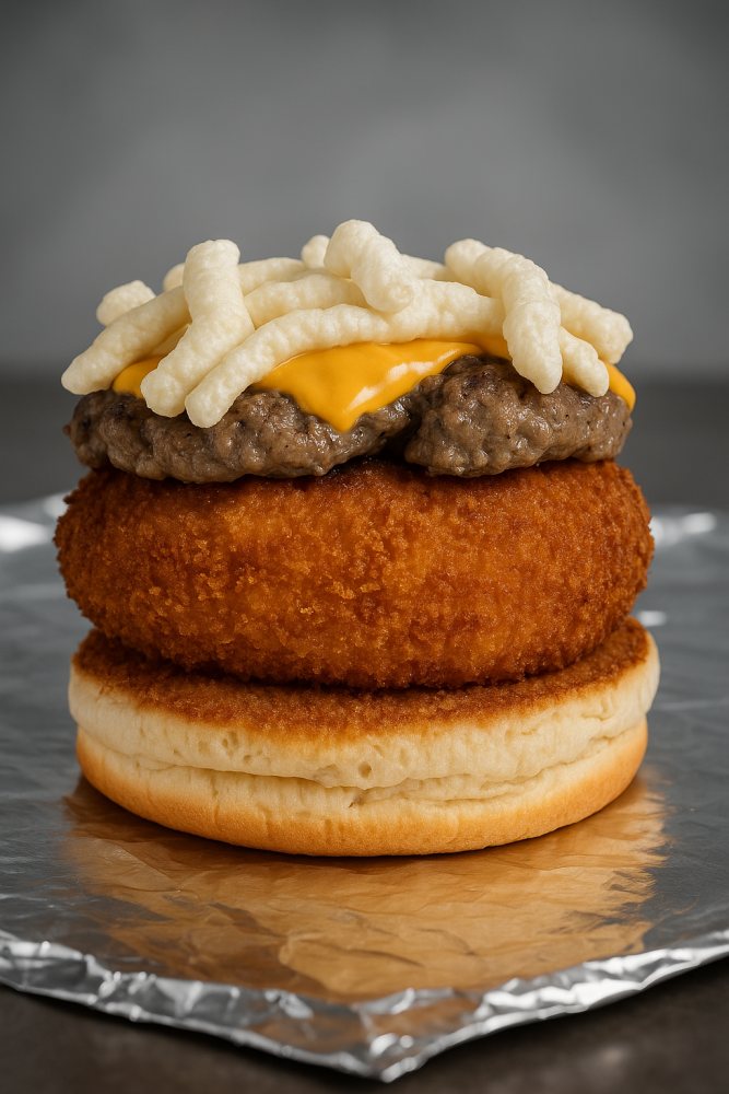 Pão brioche, hambúrguer 120g, queijo empanado, bacon, cheddar, molho da casa, molho barbecue, cream cheese, + Fritas
