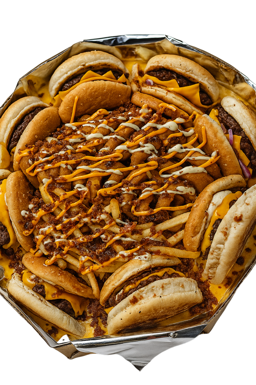 4 X Burgers cortado ao meio, mergulhados no cheddar, junto a aneis de cebola, batata, calabresa e farofa de bacon